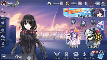 On the middle right side, you have access to the 2 major parts of the game, the Dates and Stages, which are explored in the main page of this wiki. Above these are the CG, Social and Quests, which lead to artwork and dating progression; friendlists; and stages/dailies/achievements progression, respectively.